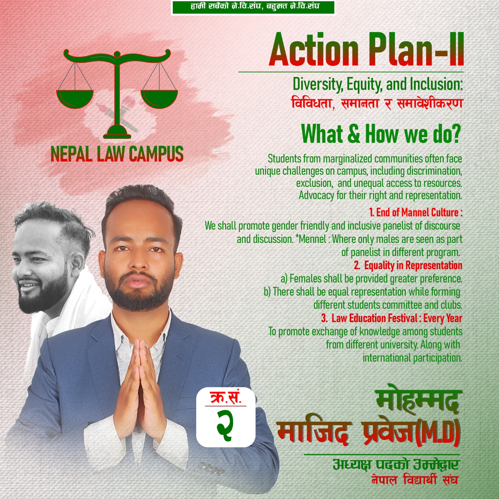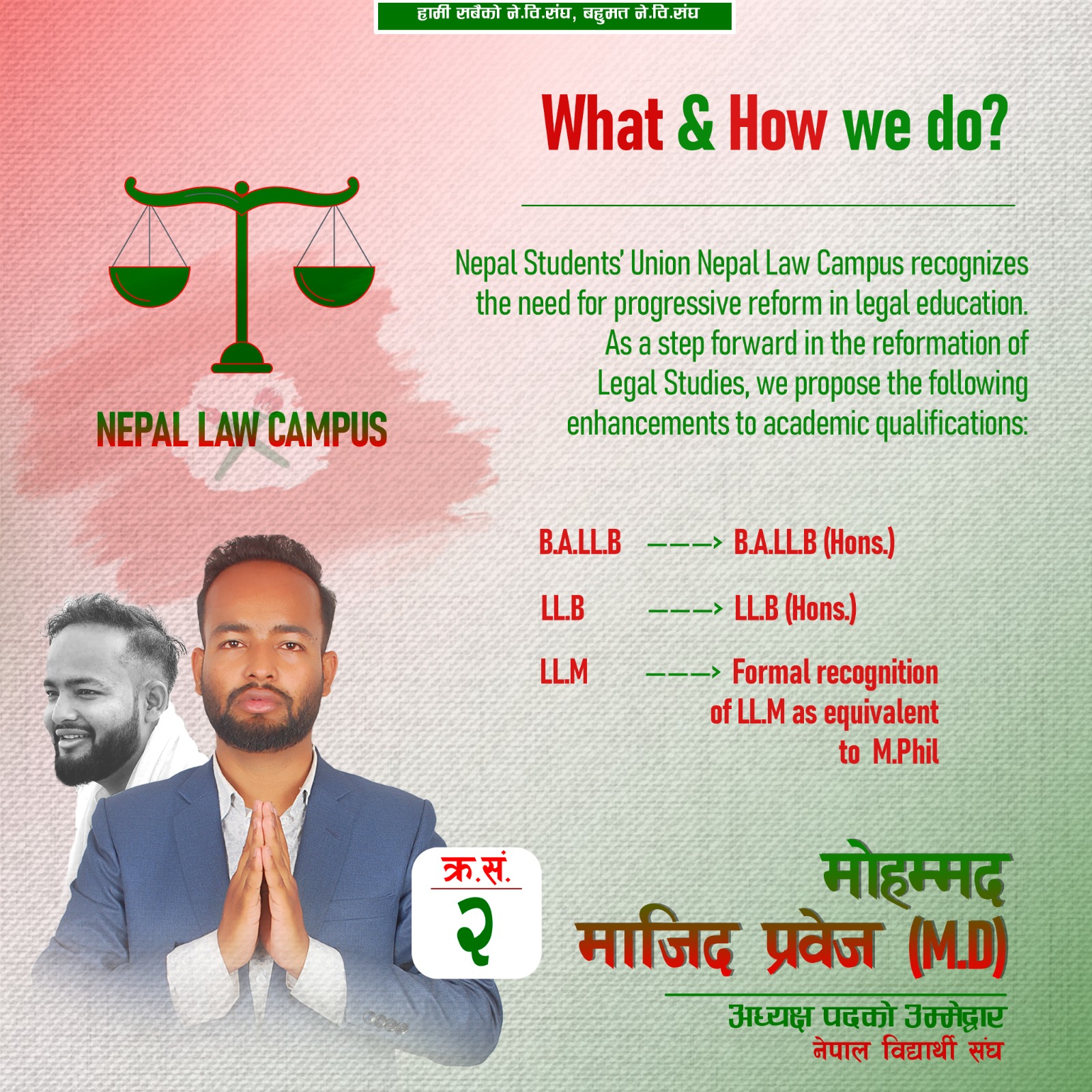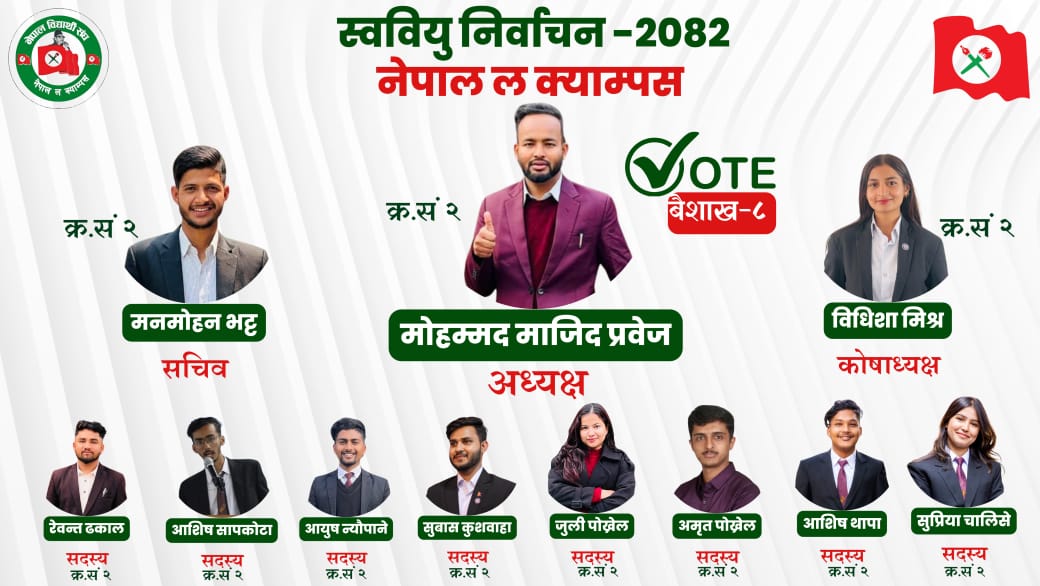 बैशाख ८ गते हुने नेपाल ल क्याम्पसको स्वतन्त्र विद्यार्थी यूनियन (स्व.वि.यु.) निर्वाचनमा मोहमम्द माजिद (MD) नेतृत्वको प्यानललाई,