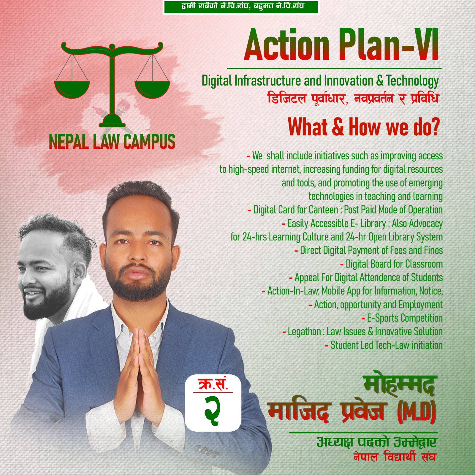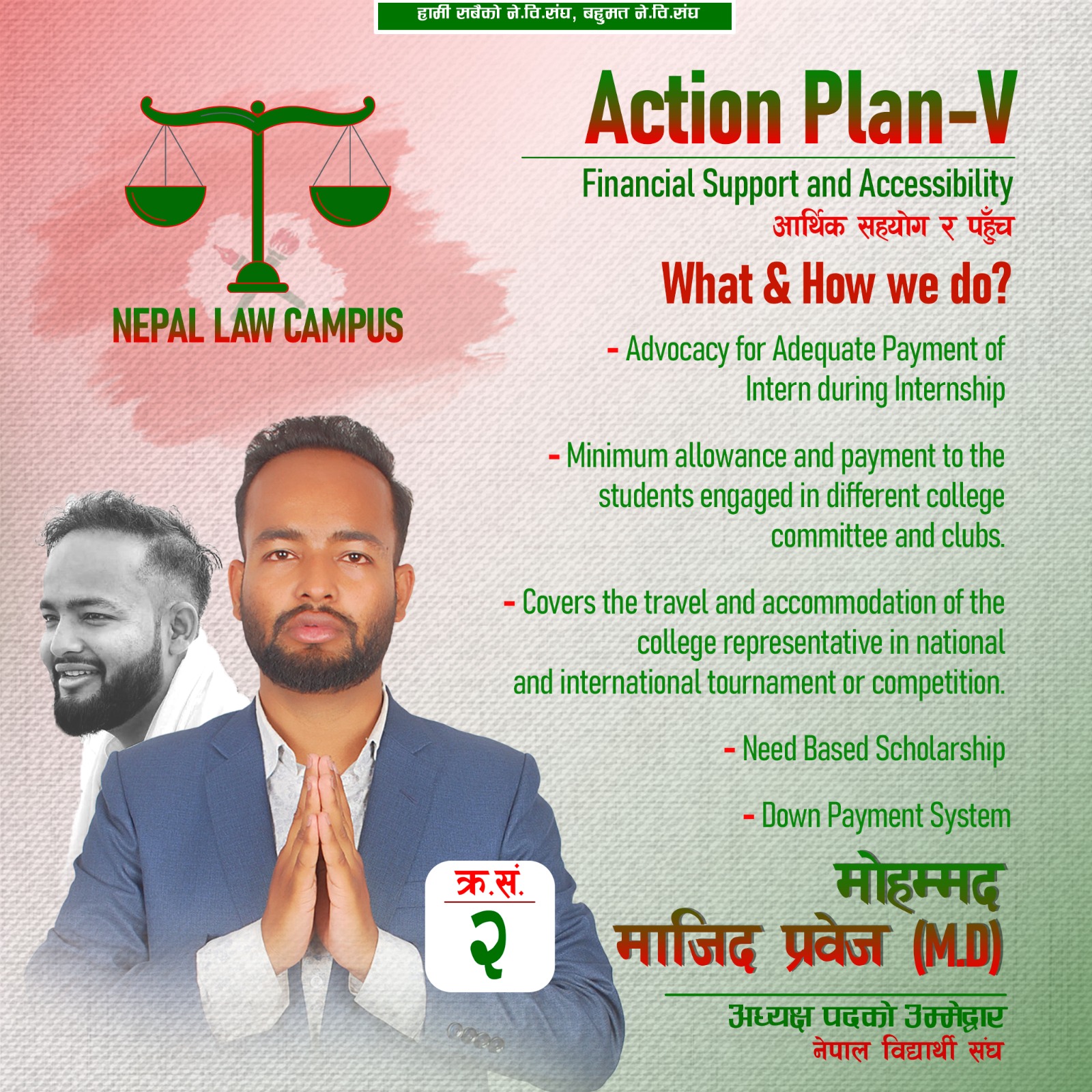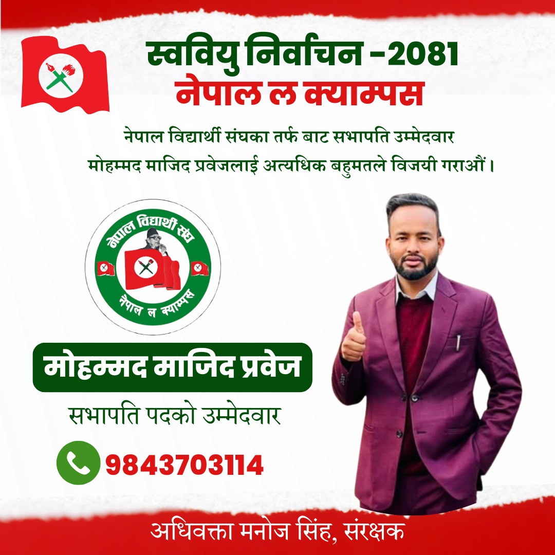 बैशाख ८ गते हुने नेपाल ल क्याम्पसको स्वतन्त्र विद्यार्थी यूनियन (स्व.वि.यु.) निर्वाचनमा मोहमम्द माजिद (MD) नेतृत्वको प्यानललाई,